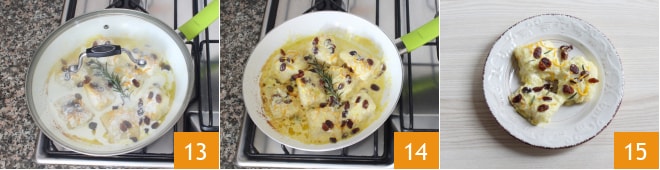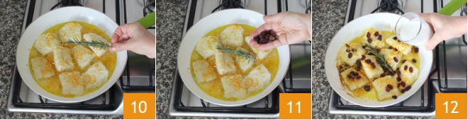 Würzen Sie mit einem Rosmarinzweig 10, salzen Sie und geben Sie die Rosinen hinzu 11. Kochen Sie weiter, um das Sösschen bei mittlerer Hitze etwa 3 Minuten einreduzieren zu lassen, dann geben Sie die Sahne hinzu 12.
