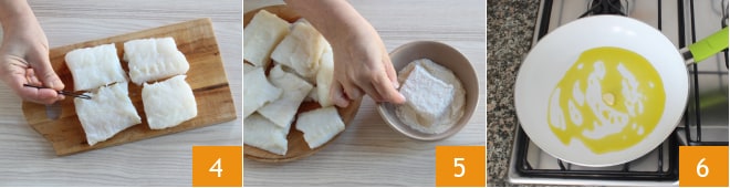 Entfernen Sie eventuell vorhandene Gräten mit einer Küchpinzette 4. Mehlieren Sie nun den Kabeljau auf allen Seiten 5. In einer Pfanne erhitzen Sie das Öl mit einer Knoblauchzehe 6.