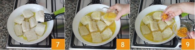 Legen Sie die Kabeljaustücke hinein 7 und braten Sie sie 3 Minuten bei mittlerer Hitze an, dann drehen Sie sie um und braten sie weitere 3 Minuten. Löschen Sie mit dem Orangensaft ab 8 und würzen Sie mit der abgeriebenen Schale 9.