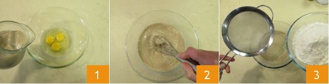 Um die Kaffee-Crêpes zuzubereiten, kochen Sie zuerst den Kaffee mit der Moka: Sie benötigen 200 g davon. Gießen Sie dann die Hälfte des Kaffees (100 g) in einen Krug, in den Sie bereits die Milch gegossen haben, und stellen Sie den Rest beiseite, den Sie für die Soße benötigen. In einer anderen Schüssel schlagen Sie die Eier auf, fügen dann die mit Kaffee verdünnte Milch hinzu 1 und rühren Sie um, um alles zu vermischen 2. Sieben Sie das Mehl direkt in die Schüssel 3.