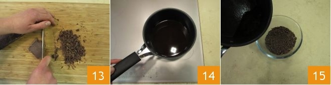 Nun zur Soße: Hacken Sie die andere Portion dunkler Schokolade 13 und erhitzen Sie den restlichen Kaffee, bis er fast kocht 14. Gießen Sie dann den Kaffee über die Schokolade 15