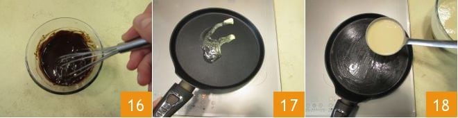 und rühren Sie, bis sie geschmolzen ist 16. Stellen Sie sie beiseite und machen Sie sich keine Sorgen, wenn die Creme fest wird; Sie müssen sie nur vor dem Überziehen der Crêpes erhitzen. Jetzt müssen Sie nur noch Ihre Crêpes backen: Erhitzen Sie eine Crêpe-Pfanne oder eine beschichtete Pfanne, fetten Sie sie mit einem Stück Butter ein 17 und gießen Sie eine Kelle Teig hinein 18.