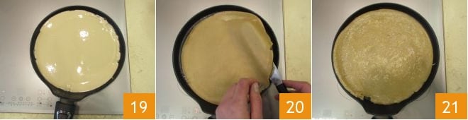 Schwenken Sie die Pfanne, um den Teig gleichmäßig zu verteilen, und backen Sie ihn etwa eine Minute lang 19. Wenn sich die klassischen Bläschen an der Oberfläche bilden und sich die Ränder lösen, drehen Sie sie um 20 und backen Sie sie auch auf der anderen Seite für etwa eine halbe Minute 21. Fahren Sie so fort, bis alle Crêpes gebacken sind.