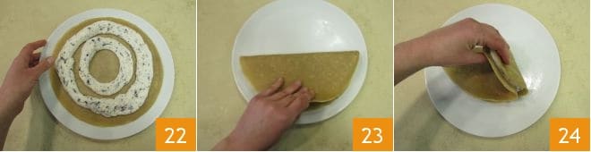 Weiter zur Füllung: Nehmen Sie die Ricottacreme und spritzen Sie einen Teil davon in die Crêpe, indem Sie zwei Runden machen 22, dann falten Sie sie zuerst in einen Halbmond 23 und dann wieder in die Hälfte 24