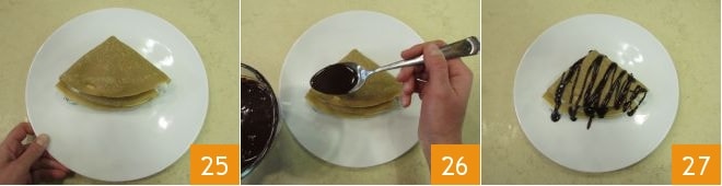 um ein Dreieck zu erhalten 25. Füllen Sie so auch alle anderen, erhitzen Sie die Schokoladensoße und verwenden Sie sie, um Ihre Kaffee-Crêpes vor dem Servieren zu dekorieren (26-27).