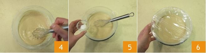 und rühren Sie mit einem Schneebesen um 4. Fügen Sie eine Prise Salz hinzu 5 und rühren Sie erneut kräftig, um einen glatten und homogenen Teig zu erhalten. Decken Sie ihn mit Folie ab 6 und lassen Sie ihn 30 Minuten im Kühlschrank ruhen.