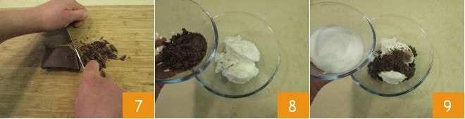 In der Zwischenzeit kümmern Sie sich um die Füllung: Hacken Sie 50 g dunkle Schokolade grob 7 und fügen Sie sie zur Ricotta hinzu 8. Geben Sie dann den Zucker hinzu 9,