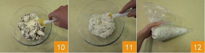 vermischen Sie alles mit einem Spatel 10 und sobald eine homogene Masse entstanden ist 11, geben Sie sie in einen Spritzbeutel 12 und legen Sie ihn in den Kühlschrank.