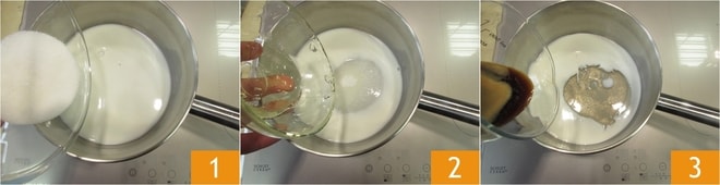 Um das Kaffee-Eis zuzubereiten, bereiten Sie zuerst den Kaffee vor. Gießen Sie dann die Milch in einen kleinen Topf, fügen Sie den Zucker 1, die Glukose 2 und den frisch zubereiteten Kaffee 3 hinzu.