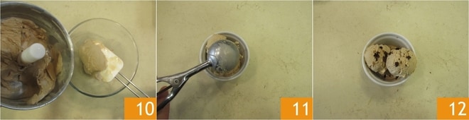 Geben Sie das Eis in eine Auflaufform 10, decken Sie es mit Folie ab und stellen Sie es für ca. 2 Stunden in den Gefrierschrank; so wird es kompakter, bleibt aber dennoch cremig. Wenn Sie möchten, können Sie diesen Schritt überspringen und es sofort genießen. Nach den zwei Stunden nehmen Sie das Eis aus dem Gefrierschrank und geben es mit einem Portionierer in Schälchen 11. Mit Schokoladenstückchen dekorieren und sofort servieren 12.