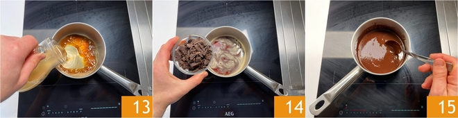 Gießen Sie den Kaffee in einen kleinen Topf 13 und erhitzen Sie ihn. Fügen Sie dann die Zartbitterschokolade hinzu 14 und rühren Sie, bis eine flüssige Sauce entsteht 15, dann füllen Sie sie in eine kleine Schüssel und lassen Sie sie abkühlen.