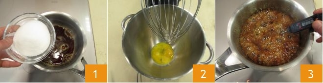 Um das Kaffee-Semifreddo zuzubereiten, geben Sie als erstes den Kaffee in einen kleinen Topf, fügen Sie den Zucker hinzu 1, rühren Sie um und bringen Sie ihn zum Kochen, wobei Sie die Temperatur im Auge behalten. In der Zwischenzeit geben Sie die Eigelbe in die Schüssel einer Küchenmaschine 2 und schalten Sie die Maschine bei niedriger Geschwindigkeit erst ein, wenn der Kaffeesirup fast die Temperatur von 121°C erreicht hat 3. Sobald der Sirup die richtige Temperatur (121°C) erreicht hat und die Eigelbe schaumig sind,