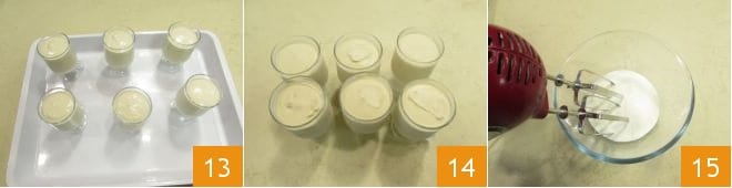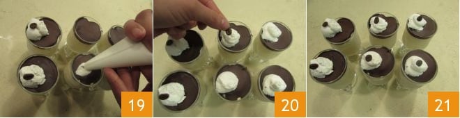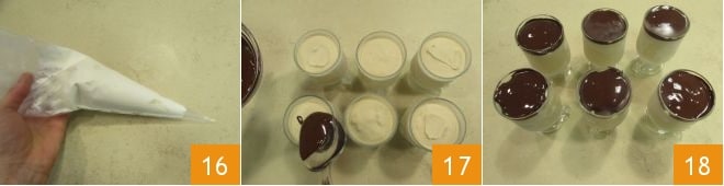 geben Sie sie in einen Spritzbeutel und lassen Sie sie einen Moment beiseite 16. Schmelzen Sie die Zartbitterschokolade im Wasserbad, achten Sie darauf, dass das Wasser des Topfes nicht in Kontakt mit der Schokolade kommt; lassen Sie sie abkühlen und verwenden Sie sie, um die Gläser zu garnieren (17-18).