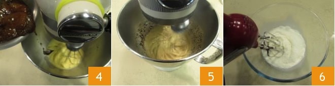 gießen Sie den Kaffee in einem dünnen Strahl ein 4 und schlagen Sie weiter, indem Sie die Geschwindigkeit der Maschine erhöhen, bis Sie eine feste Creme erhalten und die Mischung abgekühlt ist 5. Schlagen Sie dann die frische Sahne 6, die nicht steif, sondern nur halb aufgeschlagen sein soll.