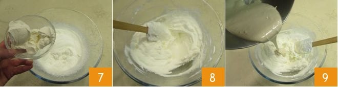 Fügen Sie dann den Mascarpone hinzu 7 und rühren Sie mit einem Spatel in kreisenden Bewegungen von unten nach oben 8, um ihn nicht zu entlüften. Fügen Sie dann auch die Kaffeemischung hinzu 9;