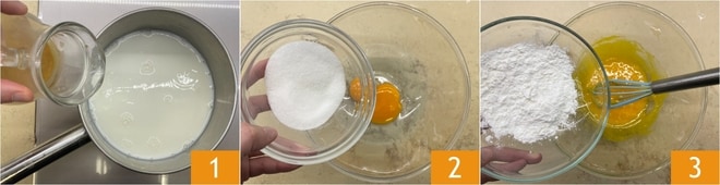 Um die Kaffee-Zeppolona zuzubereiten, beginnen Sie mit der Puddingcreme. Bereiten Sie den Kaffee zu und stellen Sie ihn beiseite. Weichen Sie die Gelatineblätter in kaltem Wasser ein, dann gießen Sie Milch und Mokka-Kaffee in einen Topf 1 und erhitzen Sie es fast bis zum Kochen. In der Zwischenzeit schlagen Sie das Eigelb mit dem Zucker in einer Schüssel 2 auf und fügen Sie die Maisstärke 3 hinzu und mischen Sie weiter.