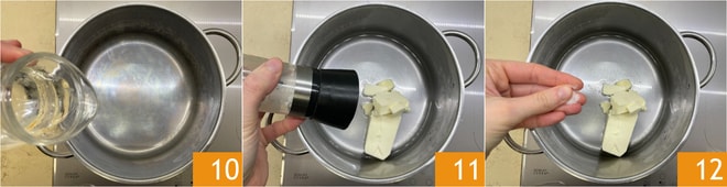 Bereiten Sie in der Zwischenzeit den Brandteig vor: Gießen Sie das Wasser in einen Topf mit dickem Boden 10, dann fügen Sie die Butter, eine Prise Salz 11 und eine Prise Zucker 12 hinzu. Stellen Sie den Herd an und bringen Sie es zum Kochen.