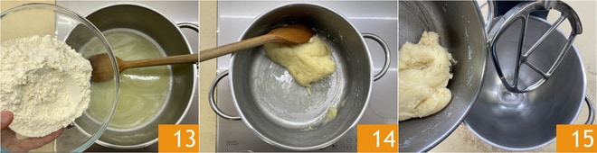 Wenn die Butter geschmolzen ist, fügen Sie das Mehl auf einmal hinzu 13 und mischen Sie schnell mit einem Holzlöffel, bis sich der Teig vollständig von den Rändern löst und der Boden mit einer matten Schicht überzogen ist 14. Übertragen Sie den Teig in eine Küchenmaschine mit Rührhaken 15.