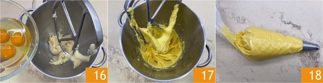 Schalten Sie die Küchenmaschine auf mittlere Geschwindigkeit und fügen Sie die Eier einzeln hinzu, wobei jedes Ei gut eingearbeitet sein muss, bevor Sie das nächste hinzufügen 16. Sie sollten eine glatte, kräftige und homogene Mischung erhalten 17. Übertragen Sie den Teig in einen Spritzbeutel mit einer 15 mm Sterndüse 18.