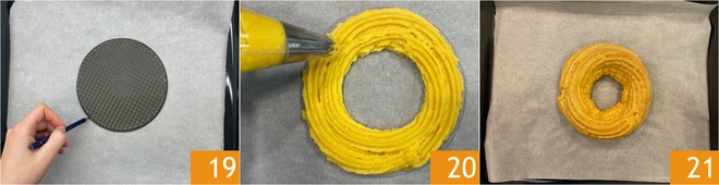 Zu diesem Zeitpunkt legen Sie ein Backblech mit Backpapier aus und zeichnen Sie mit einem Bleistift einen Kreis mit einem Durchmesser von 18 cm 19. Verwenden Sie die Bleistiftlinie als Leitfaden, um mit dem Spritzbeutel von außen beginnend 2 Kreise aus Teig zu machen, dann fügen Sie einen dritten Kreis darüber hinzu, mittig zwischen die ersten beiden 20. Backen Sie im vorgeheizten statischen Ofen bei 170°C für 45 Minuten, dann schalten Sie auf Umluft um und backen Sie bei 170°C für weitere 15 Minuten. Nach dieser Zeit überprüfen Sie die Backzeit, indem Sie die Zeppolona leicht vom Blech heben: Wenn sie leicht ist, ist sie fertig, andernfalls ist sie noch innen feucht. In diesem Fall senken Sie die Temperatur auf 150°C und backen Sie weitere 5 Minuten im Umluft-Modus. Nachdem sie fertig gebacken ist, nehmen Sie die Zeppolona aus dem Ofen und lassen Sie sie vollständig abkühlen 21.