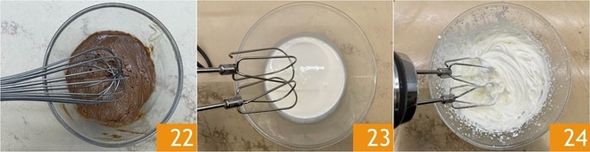 In der Zwischenzeit nehmen Sie die Puddingcreme aus dem Kühlschrank und weichen Sie sie mit einem Schneebesen auf 22. Gießen Sie die flüssige frische Sahne in eine separate Schüssel 23 und schlagen Sie sie mit einem Handrührgerät halbsteif 24.