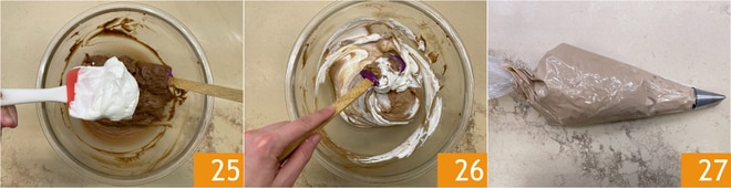 Inkorporieren Sie die halbfest geschlagene Sahne in 3 Schritten in die Creme 25, indem Sie vorsichtig von unten nach oben mit einem Spatel vermischen 26: So haben Sie eine Kaffeekrem-Diplomat erhalten. Übertragen Sie es in einen Spritzbeutel mit einer 12 mm flachen und geriffelten Düse 27.