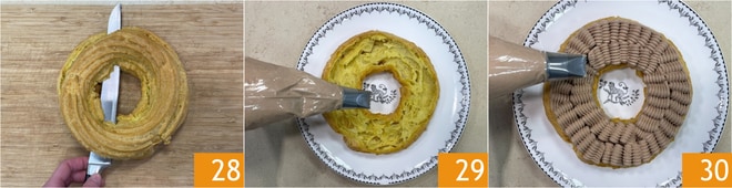 Wenn die Zeppolona abgekühlt ist, schneiden Sie sie horizontal in zwei Hälften 28, dann legen Sie den unteren Teil auf den Servierteller und füllen Sie ihn mit der Kaffeekrem-Diplomat 29, indem Sie zuerst entlang des äußeren Randes und dann im Inneren Wellenformen machen 30.