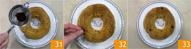 Bedecken Sie sie mit dem oberen Teil und garnieren Sie sie mit gesiebtem Kaffeepulver 31 und Kaffeebohnen 32. Ihre Kaffee-Zeppolona ist bereit, serviert zu werden 33!