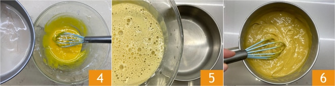 Fügen Sie die heiße Kaffeemilch zur Eigelbmischung hinzu 4 und mischen Sie gut mit dem Schneebesen, dann gießen Sie alles zurück in den Topf 5 und stellen Sie es wieder auf den Herd. Rühren Sie ständig mit dem Schneebesen, bis die Creme beginnt, sich zu verdicken 6.