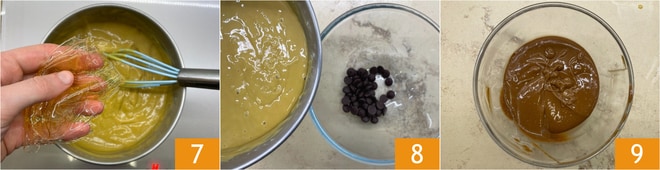 Wenn sie eingedickt ist, schalten Sie die Hitze ab und fügen Sie die gut ausgedrückte Gelatine hinzu 7. Rühren Sie gut, um sie vollständig aufzulösen. Gießen Sie die Creme in eine Schüssel, in die Sie die Schokolade in Stücke gelegt haben 8, und mischen Sie mit einem Spatel, um es gleichmäßig zu schmelzen 9. Bedecken Sie die Creme mit Frischhaltefolie und lassen Sie sie im Kühlschrank abkühlen.