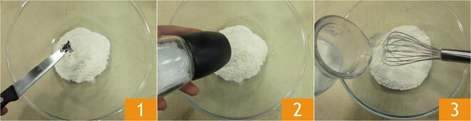 Um den Kaiserschmarren zuzubereiten, beginnen Sie damit, in eine Schüssel das Mehl, die Samen einer Vanilleschote 1, eine Prise Salz 2 und die Milch langsam hinzuzufügen, während Sie mit einem Schneebesen rühren 3.