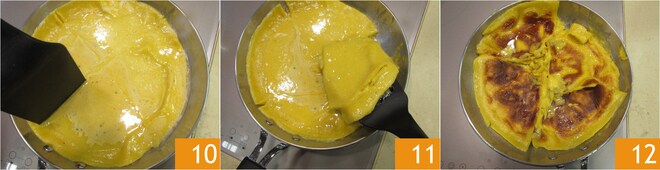Wenn die Basis gekocht und gebräunt ist, können Sie sie in 4 Teile teilen 10 11, um sie leichter zu drehen und auf der anderen Seite zu kochen 12.