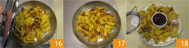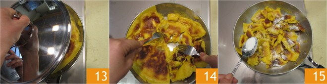 Kochen Sie weitere 2-3 Minuten, immer mit Deckel 13. Nach dieser Zeit können Sie den Deckel entfernen und mit zwei Gabeln "zupfen", um den Kaiserschmarren in grobe und unregelmäßige Stücke zu zerlegen 14. Lassen Sie ihn noch einen Moment ohne Deckel anbraten, bestreuen Sie ihn dann mit einem Esslöffel Kristallzucker 15, um ihn zu karamellisieren.
