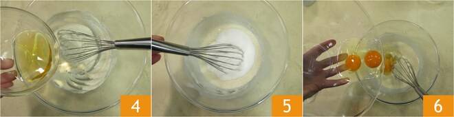 Wenn Sie die Milch eingearbeitet haben, geben Sie den Rum 4 hinzu, dann den Zucker 5 und schließlich die Eier 6 und rühren Sie die Mischung weiter mit einem Hand-Schneebesen.