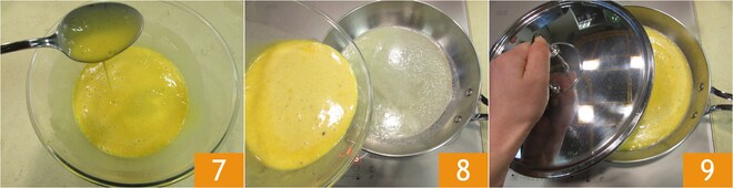Der Teig sollte homogen sein, er wird ziemlich flüssig sein 7: Stellen Sie sicher, dass keine Klumpen vorhanden sind. Nehmen Sie eine Stahlpfanne und lassen Sie die Butter bei schwacher Hitze vollständig schmelzen. Gießen Sie die Mischung in die Pfanne 8 und kochen Sie sie etwa 3-4 Minuten bei mittlerer bis hoher Hitze, mit einem Deckel bedeckt 9.