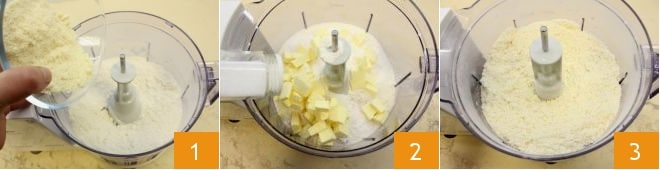 Um die kleinen Kakaotörtchen mit Mandeln und Schokoladencreme zuzubereiten, beginnen Sie mit der Herstellung der Sandmasse: Geben Sie das Mandelmehl und das gesiebte 00-Mehl in eine Küchenmaschine 1, zusammen mit der kalten Butter aus dem Kühlschrank, in Stücke geschnitten, und einer Prise Salz 2; mixen Sie für ein paar Sekunden, bis Sie eine eher grobe und sandige Masse erhalten 3.