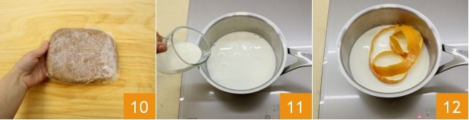 Drücken Sie die entstandene Teigkugel leicht flach und wickeln Sie sie dann in Frischhaltefolie, lassen Sie sie mindestens 1 Stunde im Kühlschrank ruhen 10. In der Zwischenzeit können Sie die Schokoladencreme zubereiten: Geben Sie die Milch und die Sahne in einen kleinen Topf 11, fügen Sie die gesamte Schale einer halben Orange hinzu 12 und erhitzen Sie es sanft, bis es fast kocht.