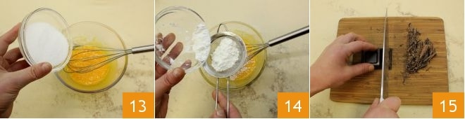In einer separaten Schüssel die Eigelbe mit dem Zucker schlagen 13, dann das Maisstärke in die Ei-Zucker-Mischung sieben 14. Hacken Sie die Zartbitterschokolade mit einem Messer und stellen Sie sie beiseite 15.
