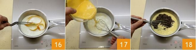 Sobald die Milch-Sahne-Mischung fast am Kochen ist, schalten Sie die Hitze aus und entfernen Sie die eingelegte Orangenschale 16. Geben Sie die vorbereitete Eiermischung hinzu 17 und erhitzen Sie bei geringer Hitze erneut, rührend mit einem Schneebesen, um die Creme einzudicken. Sobald sie eingedickt ist, schalten Sie die Hitze aus und fügen die gehackte Zartbitterschokolade hinzu, rührend, bis sie schmilzt 18.