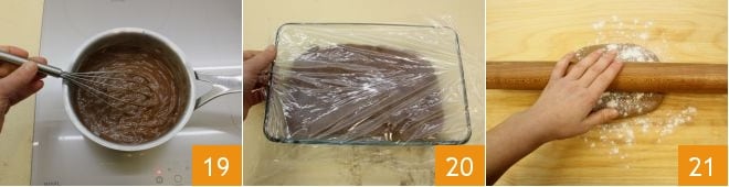 Wenn die Schokolade vollständig geschmolzen ist 19, gießen Sie die Creme in eine breite, flache Auflaufform und lassen Sie sie bei Raumtemperatur abkühlen, indem Sie sie mit Frischhaltefolie direkt abdecken 20. Danach geben Sie sie in einen Spritzbeutel ohne Tülle (an dem Sie eine Öffnung anbringen können) und bewahren sie im Kühlschrank auf. In der Zwischenzeit nehmen Sie den Mürbeteig und rollen ihn mit einem Nudelholz zu einer 3-4 mm dicken Scheibe auf einer leicht bemehlten Arbeitsfläche aus 21.
