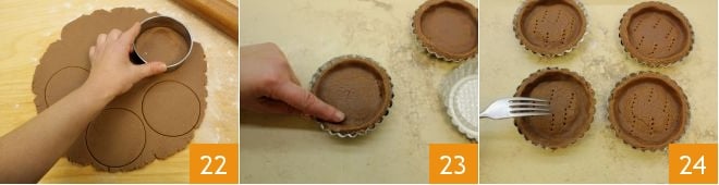 Mit einem Ausstecher von 11 cm Durchmesser 6 Scheiben ausstechen 22. Legen Sie ein Backblech mit Backpapier aus, setzen Sie 6 geriffelte Förmchen mit 8 cm Durchmesser darauf und verkleiden Sie sie mit den Mürbeteigscheiben, indem Sie mit den Fingern den Boden und die Ränder formen 23. Schneiden Sie mit einem Messer den überschüssigen Teig ab (aus den Resten können Sie Kekse machen) und stechen Sie den Boden mit einer Gabel mehrmals ein 24.