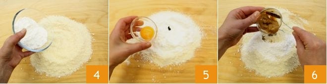 Geben Sie die Sandmasse auf eine Arbeitsfläche und formen Sie mit den Händen eine Mulde. In die Mitte geben Sie den gesiebten Puderzucker 4. Nehmen Sie die Vanilleschote, schneiden Sie sie der Länge nach auf und kratzen Sie mit einem Messer die Samen heraus; fügen Sie die Samen zusammen mit dem ganzen Ei 5 und der Mandelpaste 6 in die Mitte der Mulde.