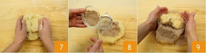 Kneten Sie schnell, nur solange, bis der Teig zusammenhält 7, damit der Mürbeteig nicht zu warm wird und krümelig bleibt; fügen Sie dann auch das gesiebte Kakaopulver hinzu 8; kneten Sie erneut sehr schnell 9 und formen Sie einen Laib.