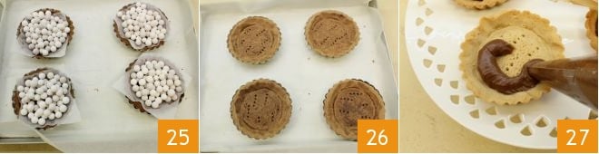 Wenn Sie alle Förmchen ausgekleidet haben, schneiden Sie 6 Quadrate aus 8 cm Backpapier aus und legen Sie diese auf den Boden der Förmchen. Legen Sie darauf Keramikgewichte für das Blindbacken 25 (oder verwenden Sie getrocknete Hülsenfrüchte wie Kichererbsen oder Bohnen) und backen Sie sie im vorgeheizten statischen Ofen bei 170°C für 15 Minuten (oder 150°C für 10-15 Minuten im Umluftofen). Nehmen Sie die kleinen Törtchen heraus, entfernen Sie die Keramikkugeln und das Backpapier und backen Sie sie bei derselben Temperatur weitere 5 Minuten, damit der Mürbeteig gut austrocknet. Nach dem Backen nehmen Sie sie heraus und lassen sie abkühlen, bevor Sie sie aus den Förmchen nehmen 26. Füllen Sie jedes Törtchen, indem Sie die Schokoladencreme mit dem Spritzbeutel hineingeben 27