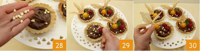 Und dekorieren Sie mit ein paar Tropfen weißer Schokolade 28, Himbeeren 29, Physalis 30 und einem Minzblatt. Zum Schluss können Sie Ihre kleinen Kakaotörtchen mit Mandeln und Schokoladencreme servieren und genießen.