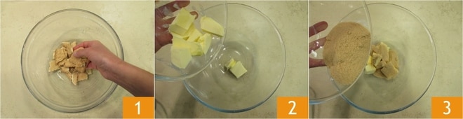 Um den Kakaosalami zuzubereiten, zerbröseln Sie zunächst die Kekse 1 und stellen Sie sie beiseite. Geben Sie die weiche Butter 2 und den braunen Zucker 3 in eine große Schüssel.
