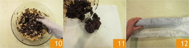 Mischen Sie die Zutaten gut, um alles zu verbinden 10. Übertragen Sie die Masse auf ein Blatt Backpapier 11 und formen Sie mit den Händen eine Wurst, indem Sie das Papier aufrollen 12.