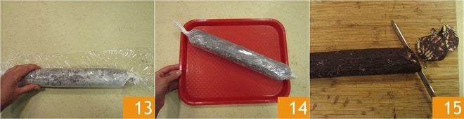 Drücken Sie fest, um es zu verdichten, und wickeln Sie den Salami in Frischhaltefolie 13. Lassen Sie es etwa 2 Stunden im Kühlschrank fest werden. Schneiden Sie den Kakaosalami in Scheiben und genießen Sie ihn 15!