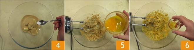 Fügen Sie auch das Salz 4 hinzu und verarbeiten Sie die Zutaten mit einem elektrischen Handrührgerät, bis Sie eine homogene Masse erhalten. Fügen Sie die Eigelb 5 und den Likör 6 hinzu.