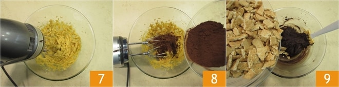Mischen Sie erneut, bis alles vollständig absorbiert ist 7. Geben Sie schließlich das gesiebte Kakaopulver 8 in die Schüssel und arbeiten Sie mit dem elektrischen Handrührgerät für ein paar Sekunden. Fügen Sie die zerbröselten Kekse in die Schüssel 9 hinzu.